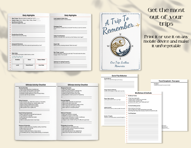 A Trip to Remember – Digital Edition brings together your love for travel and the ease of digital living. Whether you're planning a weekend escape or a bucket list adventure, this journal helps you slow down, document your story, and relive every beautiful detail — anytime, anywhere.